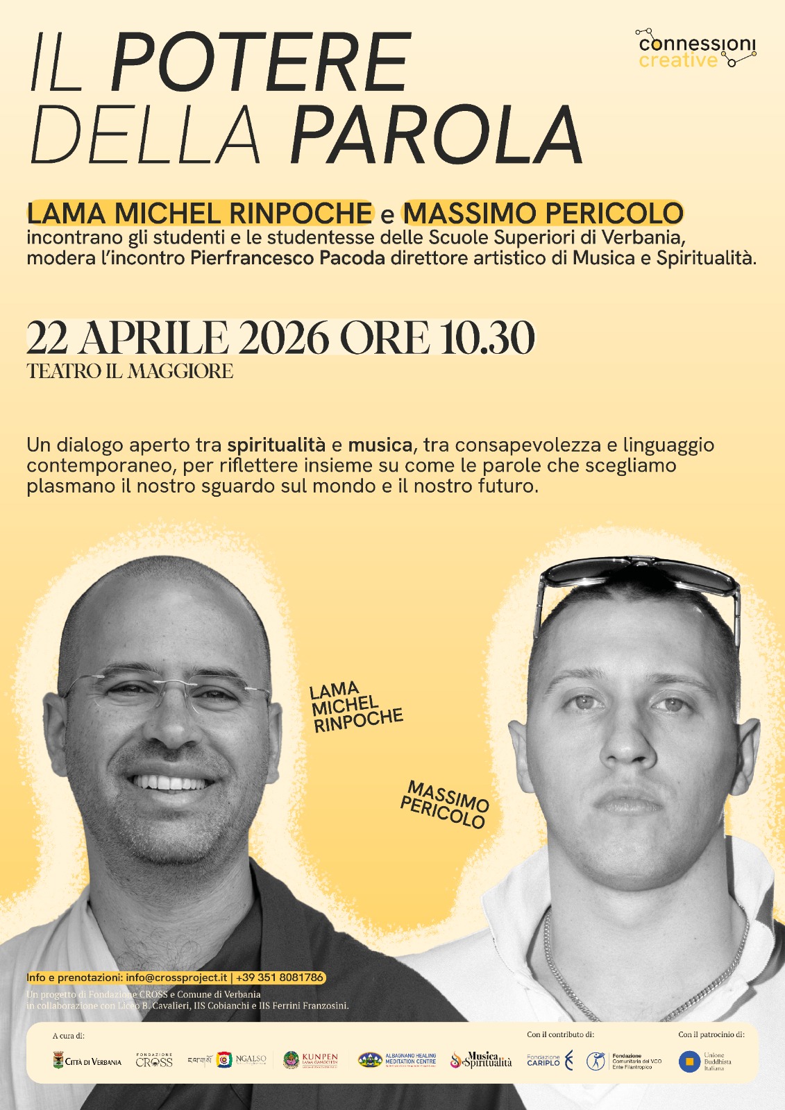 IL POTERE DELLA PAROLA LAMA MICHEL RINPOCHE e MASSIMO PERICOLO incontrano gli studenti e le studentesse delle Scuole Superiori di Verbania, modera l’incontro Pierfrancesco Pacoda direttore artistico di Musica